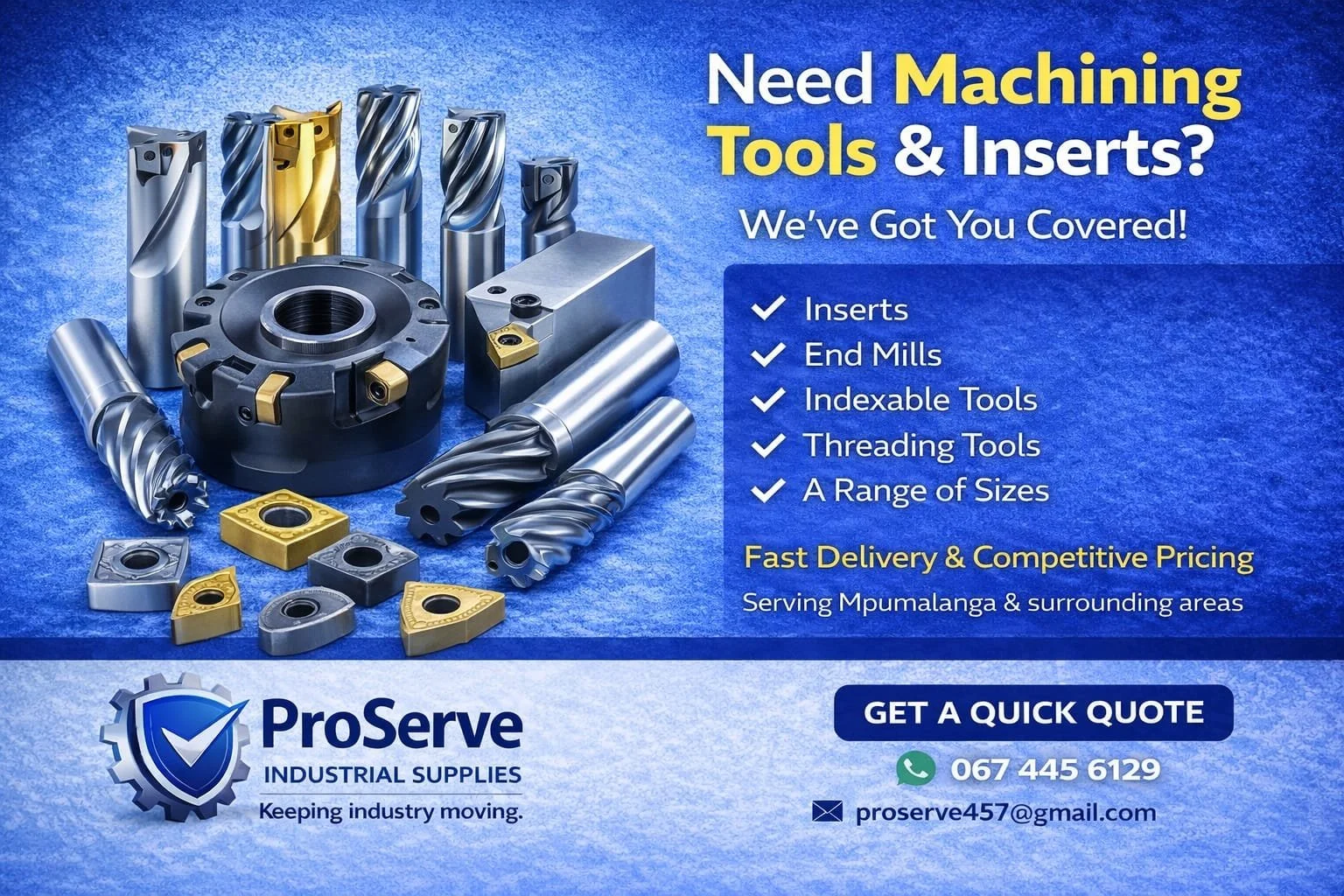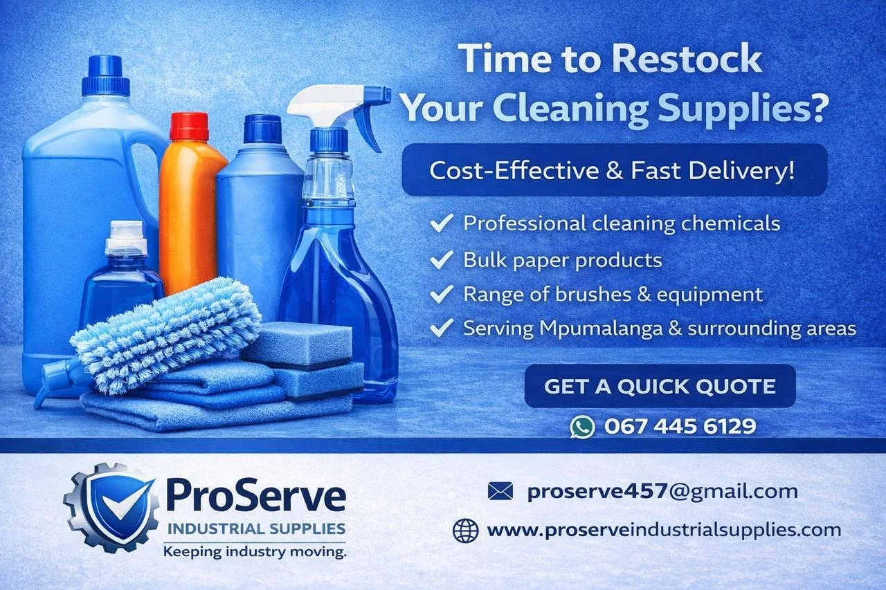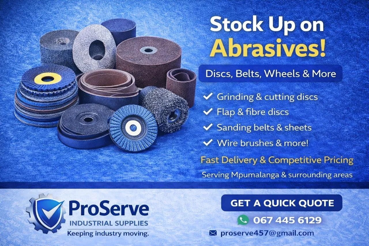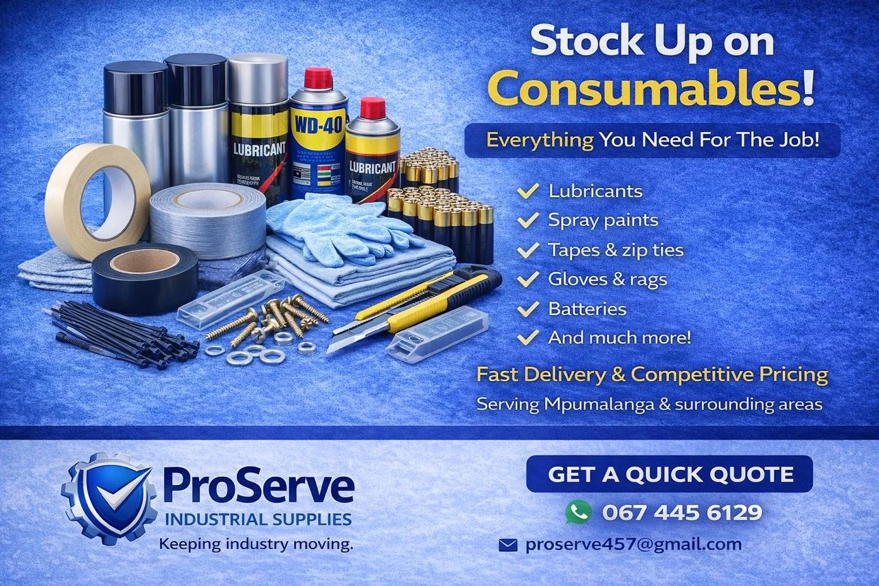 ProServe Industrial Supplies is a Mpumalanga based supplier of engineering, mining and industrial consumables. We focus on reliable sourcing, competitive pricing and on-demand supply to support workshops, contractors, plants and mining-related operations.